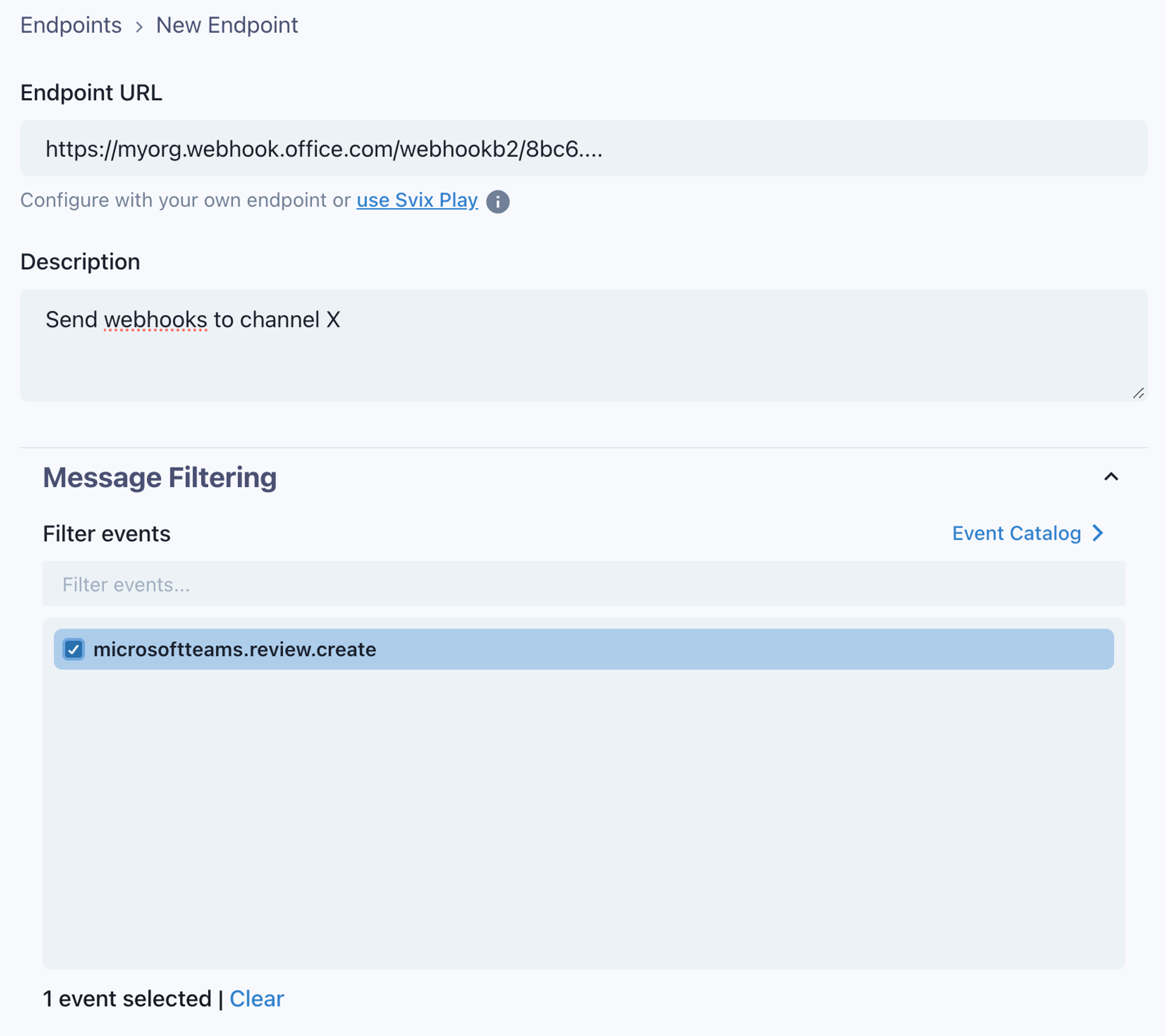 Create an endpoint by adding the URL obtained when creating an incoming webhook in the previous step. And select the events that you wish to send.