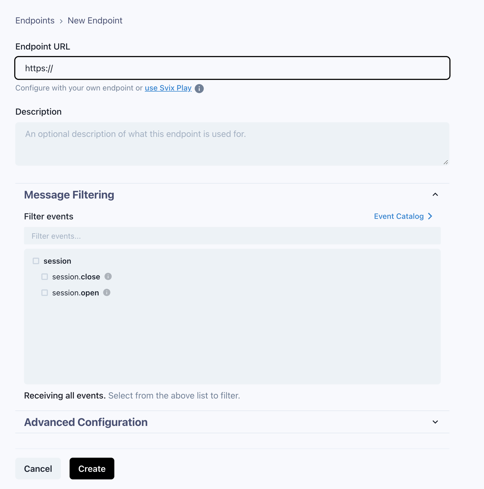 To route these messages to your SIEM, add your public endpoint that will receive these messages. Click on the Endpoints link.Adding endpoints to a self-hosted Svix instance is only available via svix command line or api.